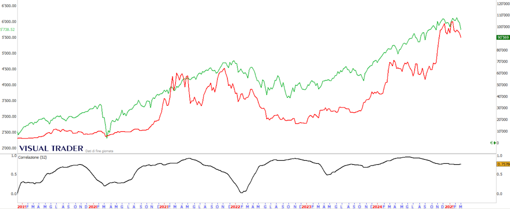 Probably the flow of money into the 2 markets has followed similar paths; in practice the risk-on and risk-off phases, related to risk appetite on the part of traders, are similar in the 2 markets. I could also show a similar graph with Bitcoin and Nasdaq100 and get similar results.