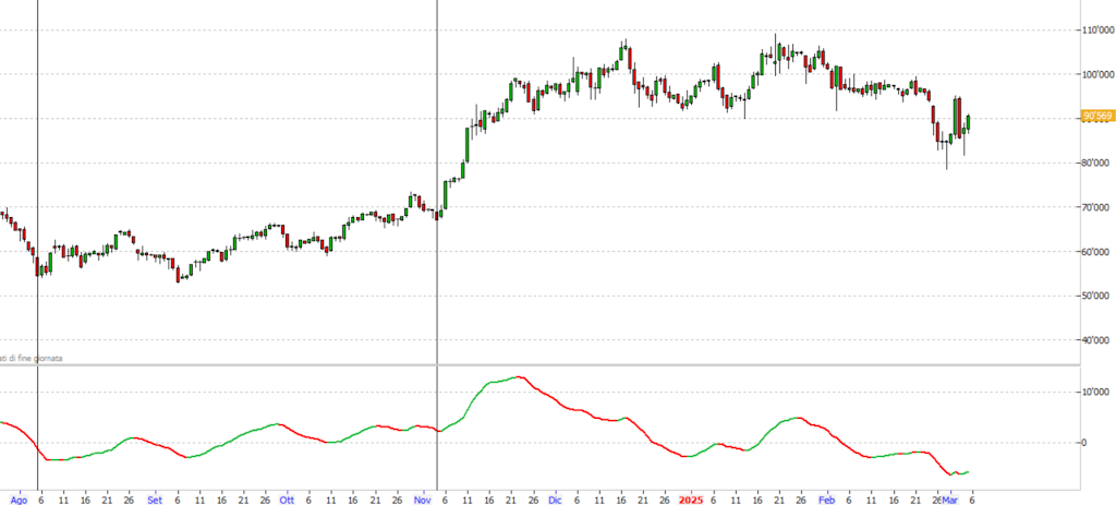 From November 4, 2024 (see vertical line in the middle) there was a definite bullish impulse, with the start of a new cyclical phase, until the high of November 17, with values rising from about $67000 to $108000. Thereafter there were alternating phases with substantial laterality and prices always above $ support. Since February 25 there has been a decline below this support with a low even below $80000 on February 28 (see blue arrow). Notice how the cyclical indicator below has proceeded with a steady descent.