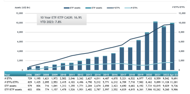 Global ETF and ETP assets as of the end of April 2023