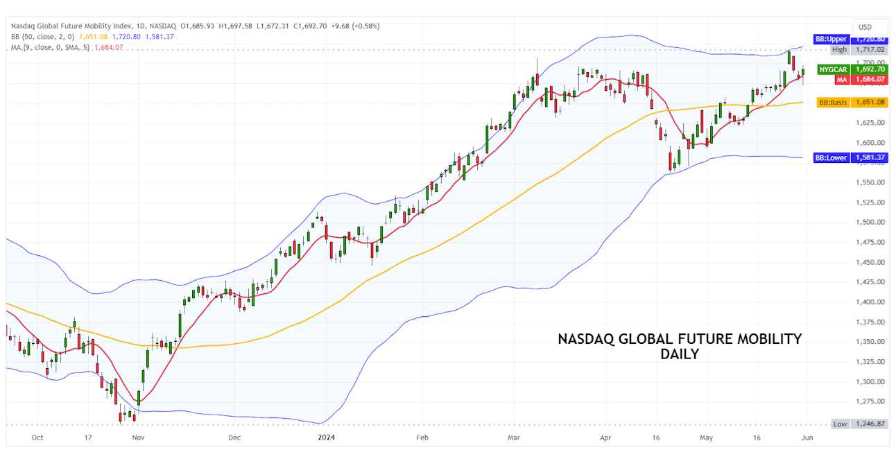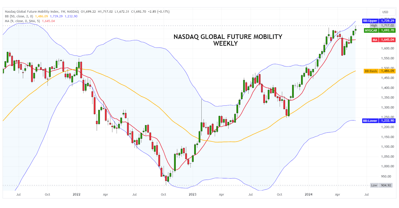 The performance of the Nasdaq Global Future Mobility index demonstrates the importance of this important development related to transport modes: the quotations are in fact within a solid medium-term bullish trend, which began in October 2022 when a low of 905 points was reached.