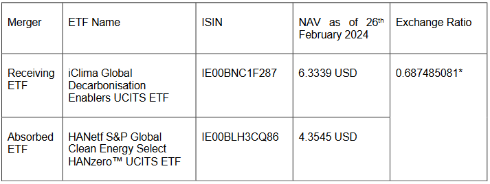 * Shareholders will receive 0.687485081 shares in iClima Global Decarbonisation Enablers UCITS ETF for each share in HANetf S&P Global Clean Energy Select HANzero™ UCITS ETF