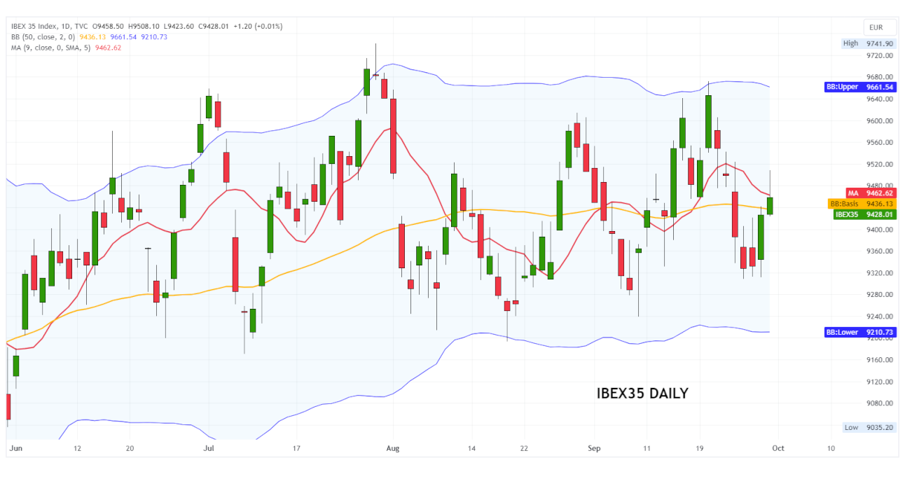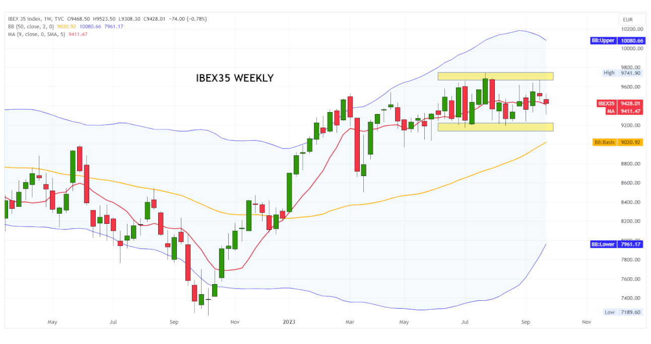 The Ibex35 index (reference benchmark of the Spanish stock market) has been fluctuating sideways for over three months within a horizontal channel bounded by resistance at 9,700-9,750 points and support at 9,200-9,170 points.